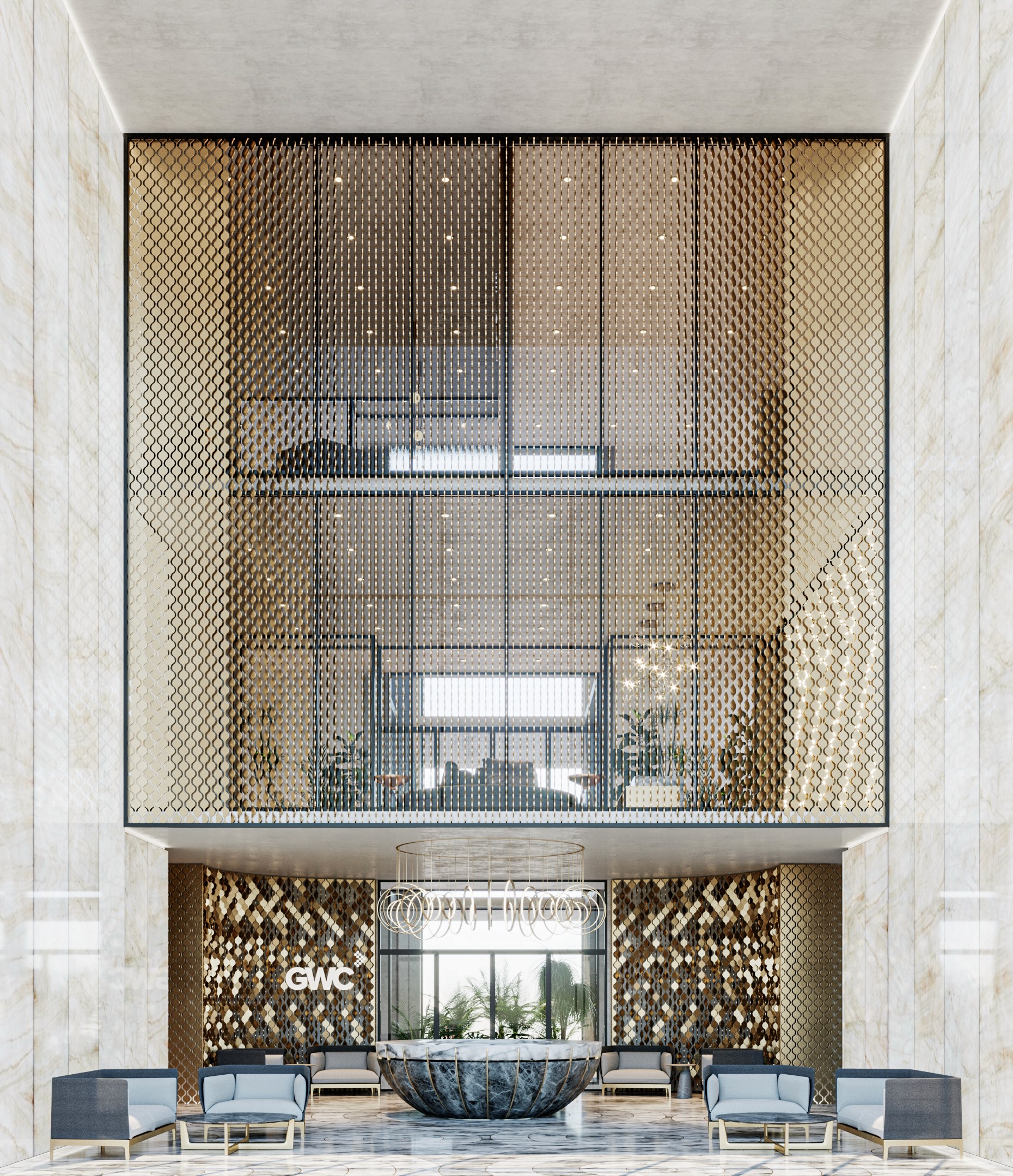 Interieurrenders van het nieuwe kantoor van GWC Logistics in het Midden-Oosten, ontworpen met focus op efficiëntie, functionaliteit en een sterke internationale identiteit.