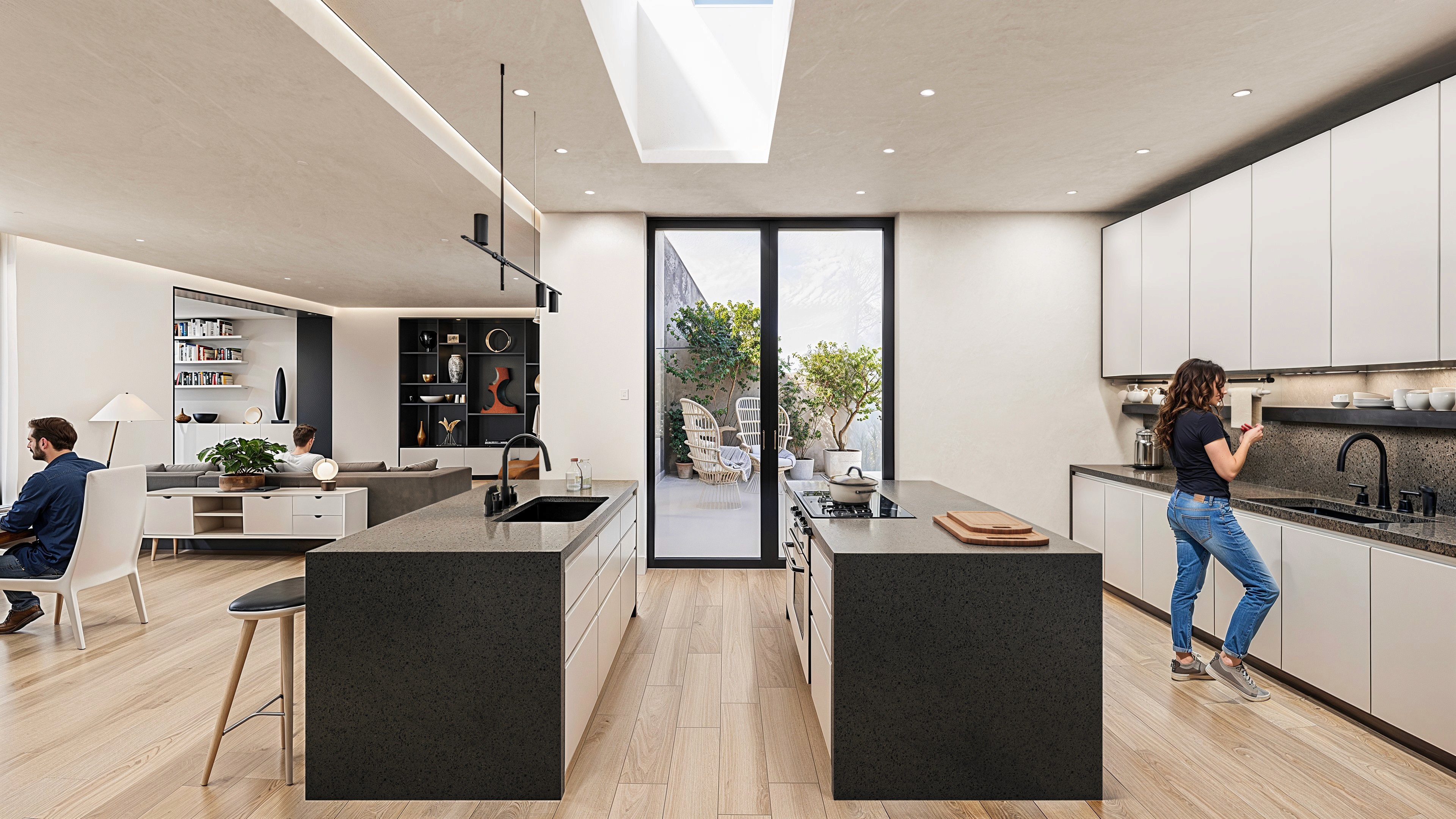 Voor een kantoorrenovatie met transformatie naar woonruimte heb ik 3D-impressies gemaakt die het nieuwe woonconcept helder en realistisch in beeld brengen