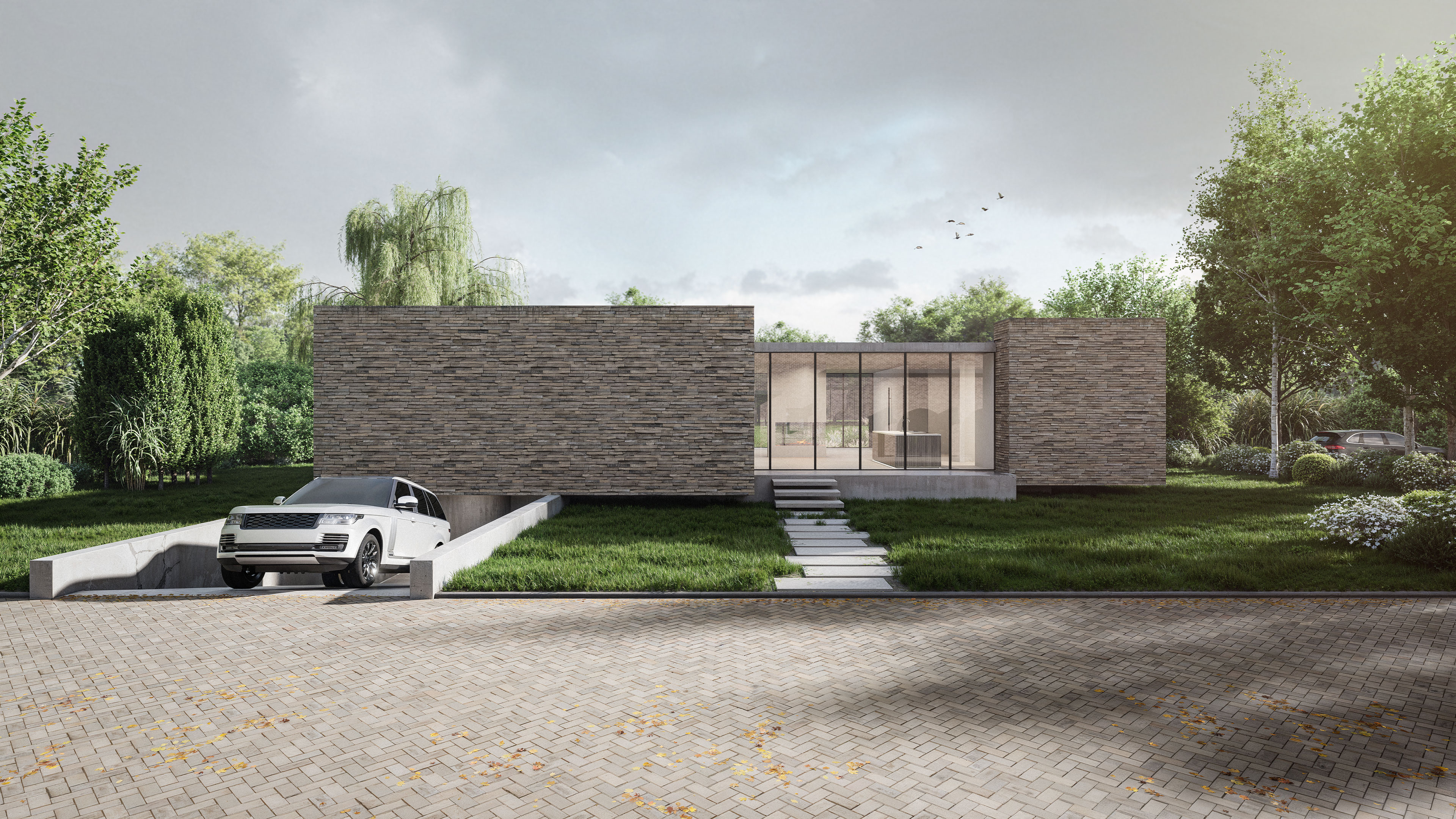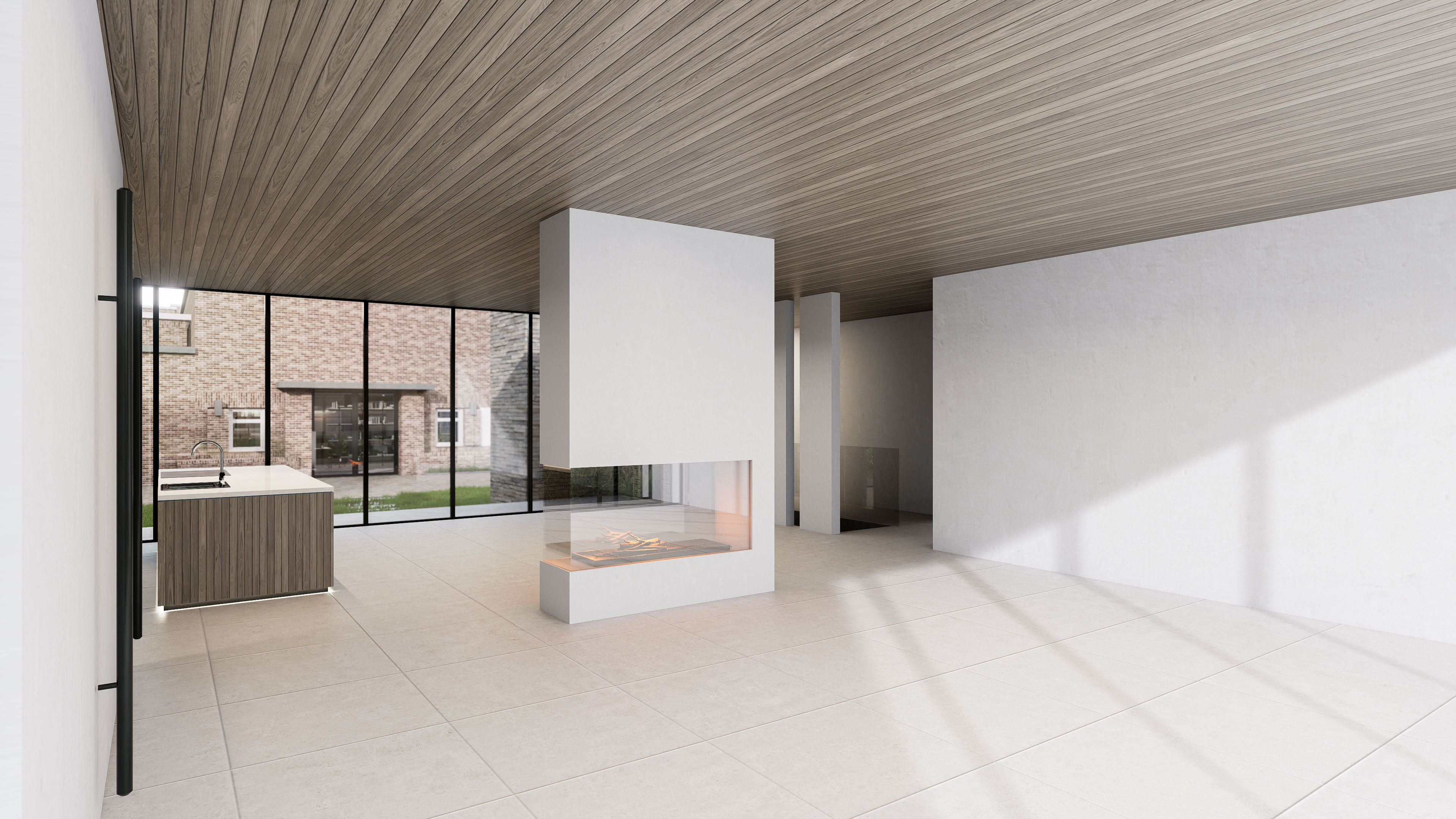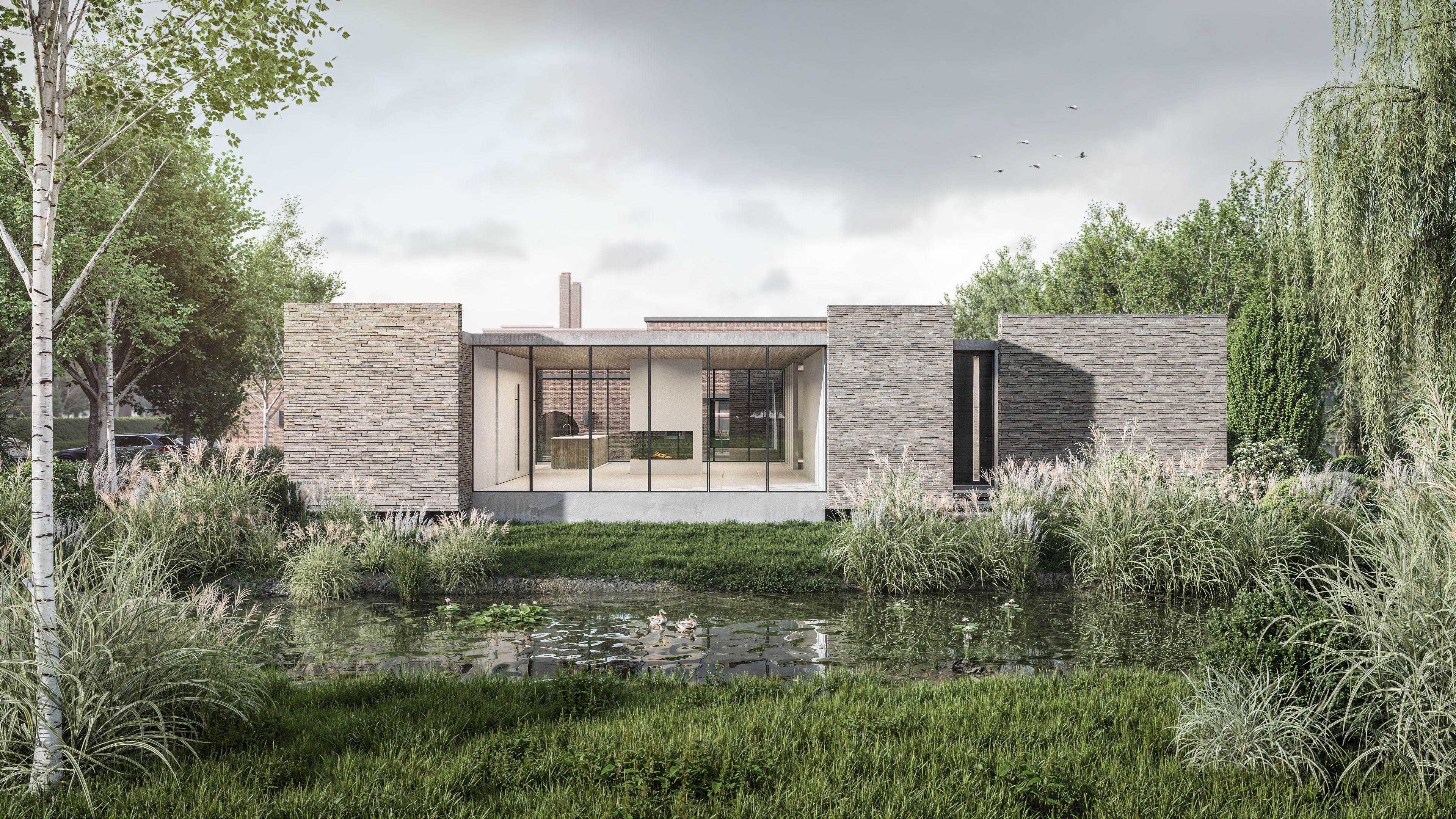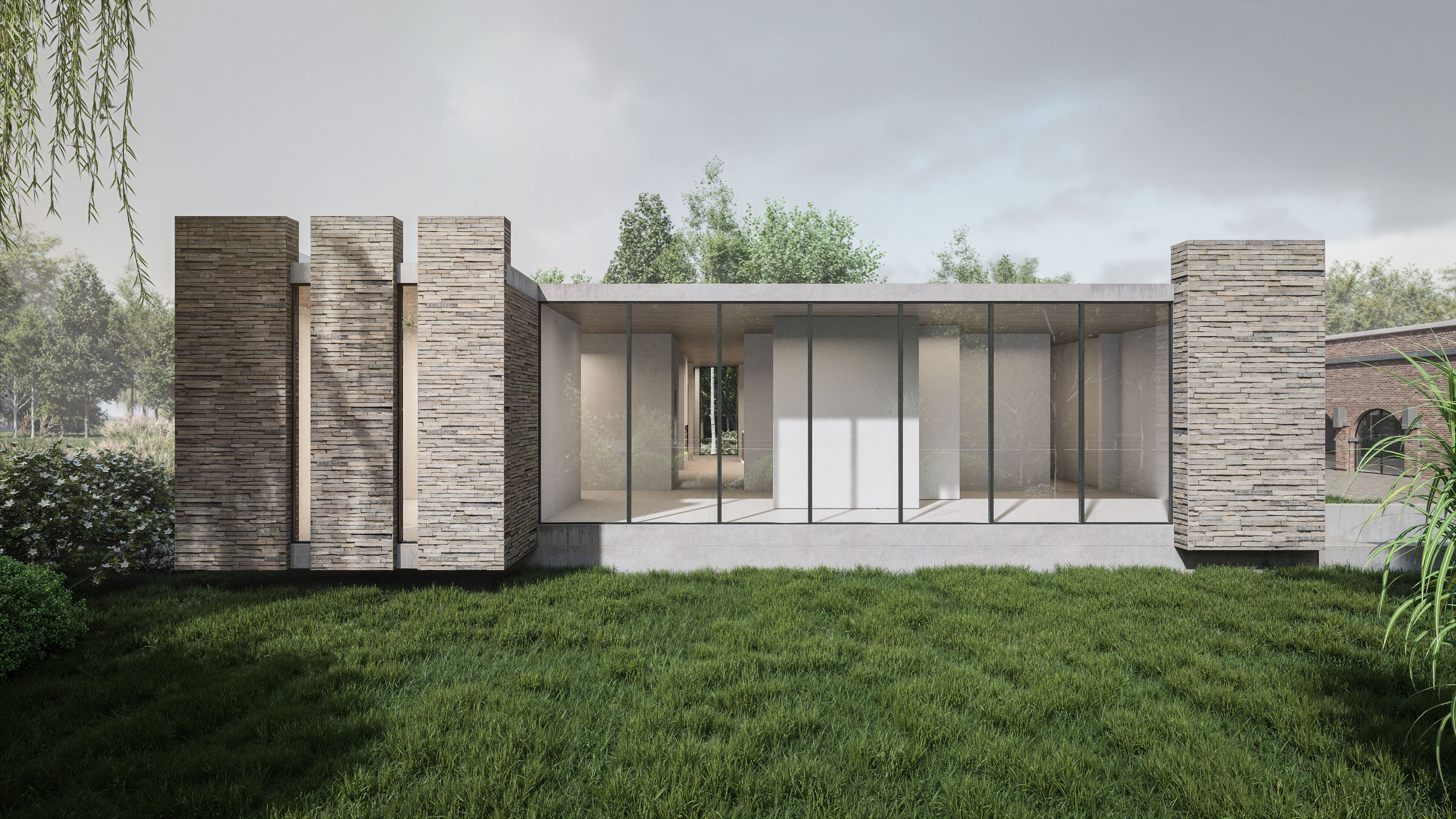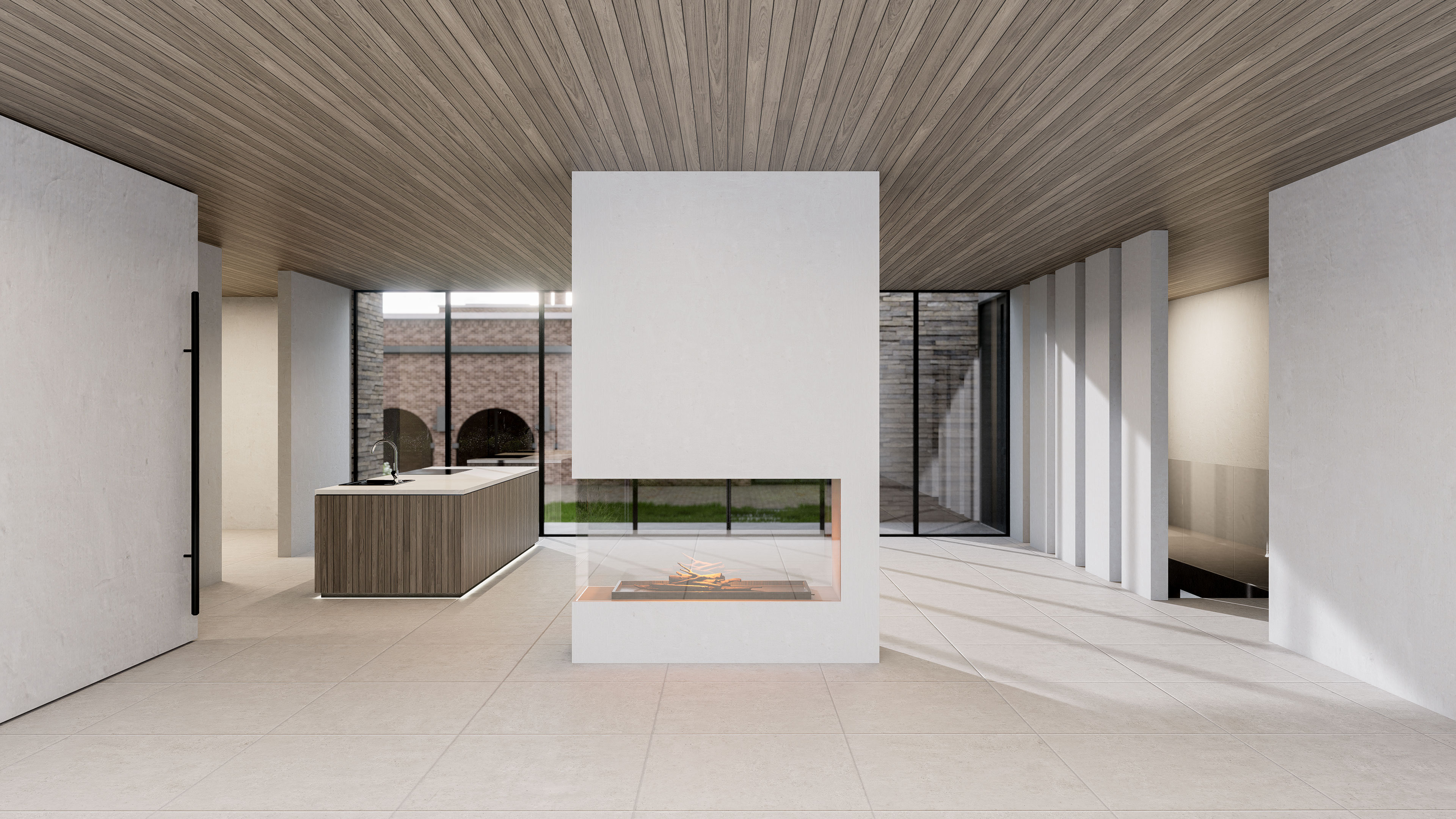 Grote stalen raampartijen laten daglicht diep de ruimte binnenvloeien, terwijl de aardse materialen van steen en hout een warme, neutrale achtergrond vormen. De doordachte doorzichting van ruimte naar ruimte creëert een natuurlijke route langs de werken.