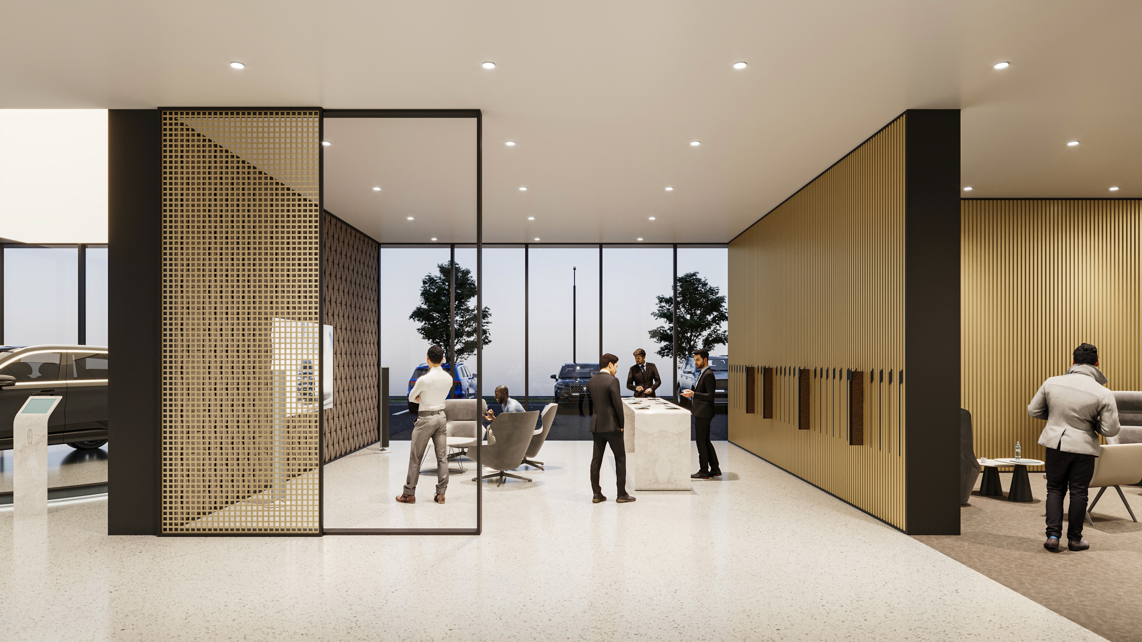 De visualisatie toont een hoogwaardige, eigentijdse winkelomgeving waarin architectuur, materiaalgebruik en verlichting samen zorgen voor een exclusieve beleving. Met strakke lijnen, een open opzet en verfijnde details sluit het ontwerp perfect aan bij de premium positionering van Lincoln en de dynamiek van een wereldstad als Shanghai.