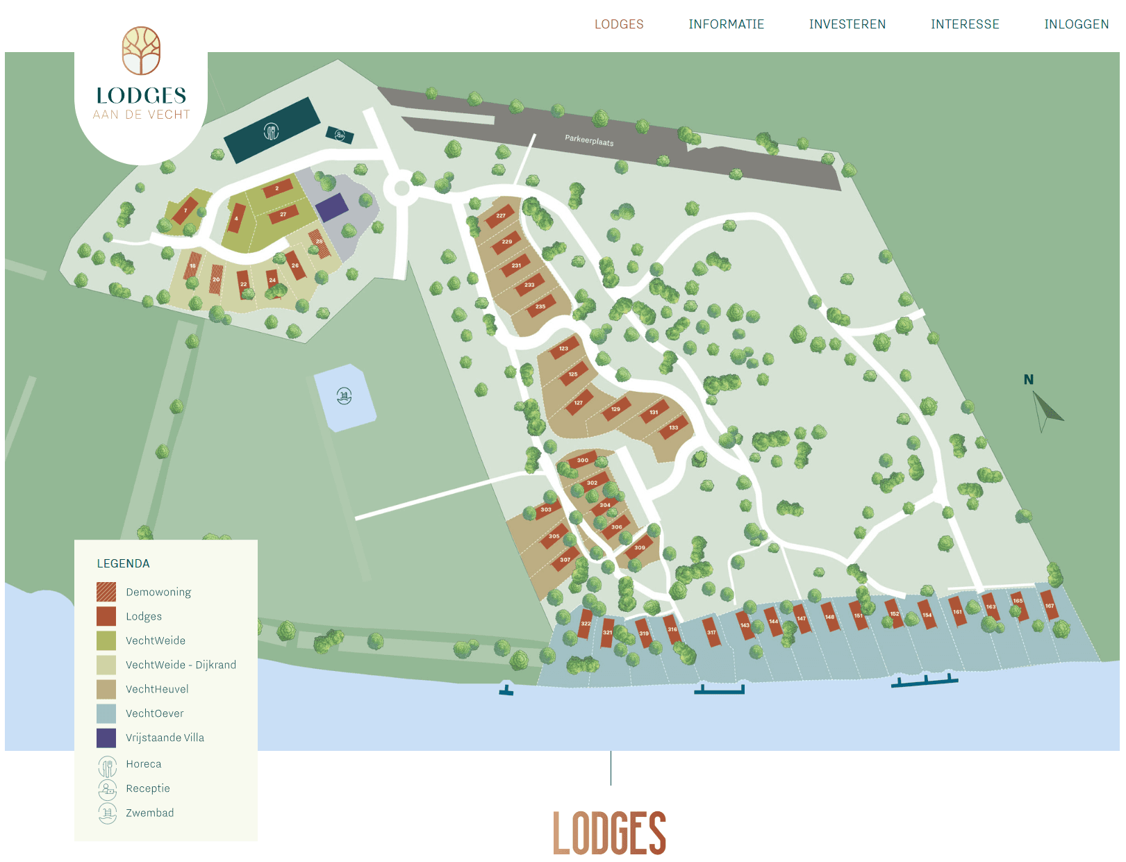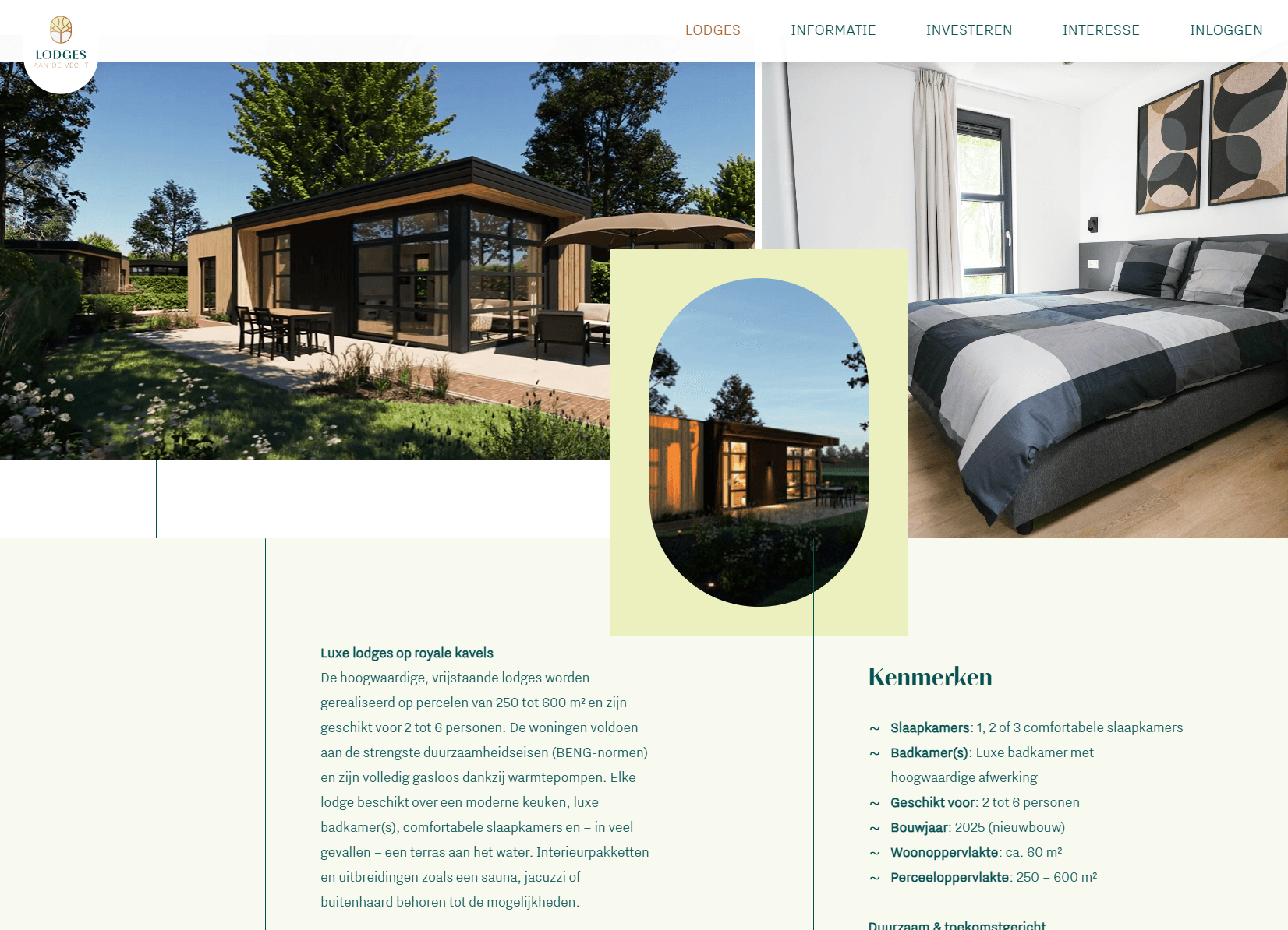 De visualisaties laten zien hoe de lodges opgaan in hun natuurlijke omgeving, met veel aandacht voor licht, ruimte en zicht op het water en het groen. Zowel het exterieur als het interieur stralen comfort en verfijning uit, waarbij natuurlijke materialen en een moderne uitstraling elkaar versterken.